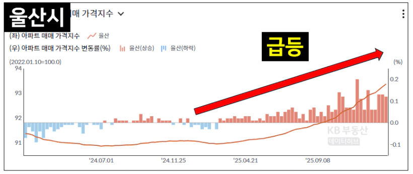하지만 모두가 아시는 것 처럼 청주는 계속 상승과 하락을 반복하면서 횡보하는 시장이였지만, 울산은 임장보고서에 작성한 것 처럼 공급이 줄어드는 2025년 폭발적인 상승이 있었습니다.