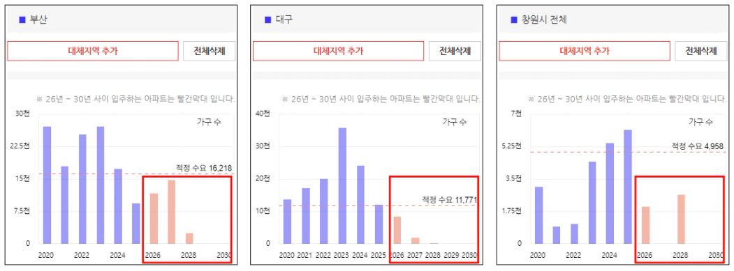 부산, 대구, 창원과 같은 지역이 직전 2025년까지는 큰 공급이 있었지만, 향후 3년간은 적정 공급 이하로 예정되어 있습니다.