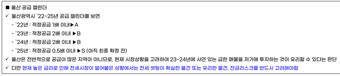 저는 울산이 2023년에는 공급이 단기적으로 많지만 2024년 이후로 줄어들기에 2023년이 기회라고 임장보고서에 작성했었지만,