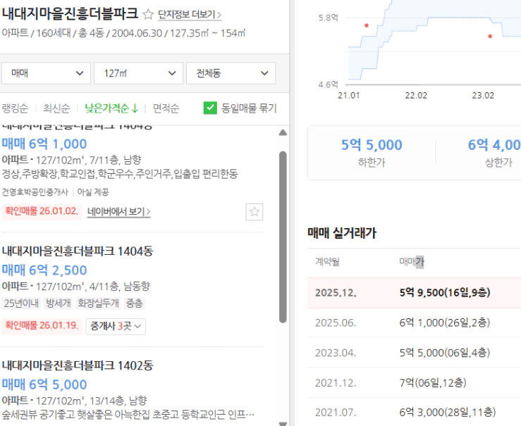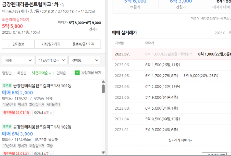 실거래 자료에 따르면 동일 평형의 가장 최근 거래는 25.12월로 5.95억에 거래되었습니다. 그리고 2025년 6월 26일 2층 매물이 6억 1,000만 원에 거래된 건입니다.