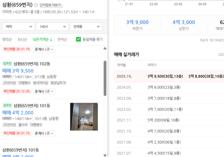 실거래 자료를 분석하면 동일 평형의 최근 거래는 2025년 10월 30일 13층이 3억 9,500만 원, 10월 28일 10층이 3억 8,800만 원에 거래되었습니다.