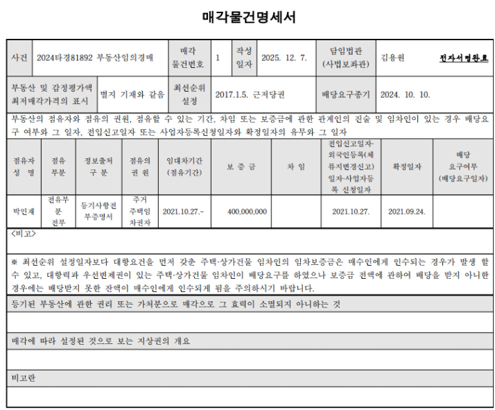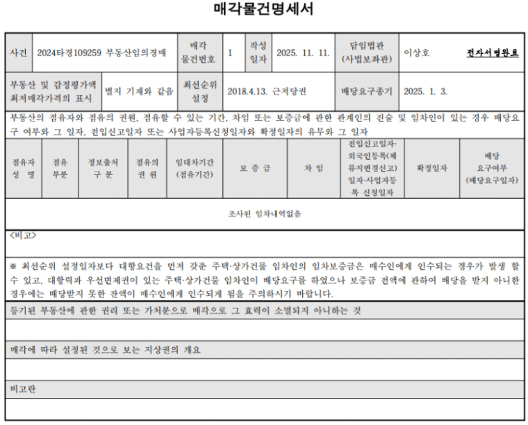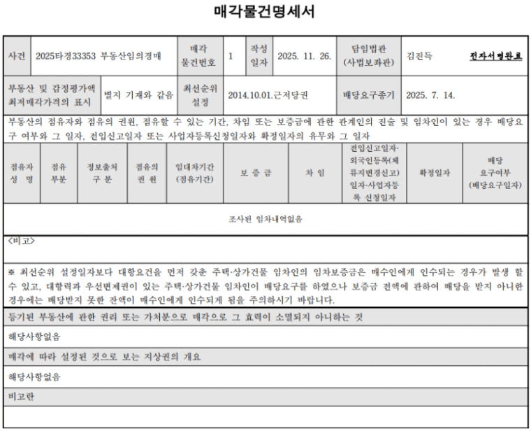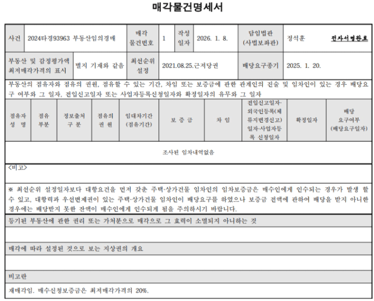 현황조사 결과 소유자 세대가 전입되어 점유 중이며 낙찰자가 인수해야 할 대항력 있는 임차인은 없는 것으로 확인됩니다. 등기부상 권리 관계는 깨끗하게 정리될 수 있는 안전한 물건입니다.