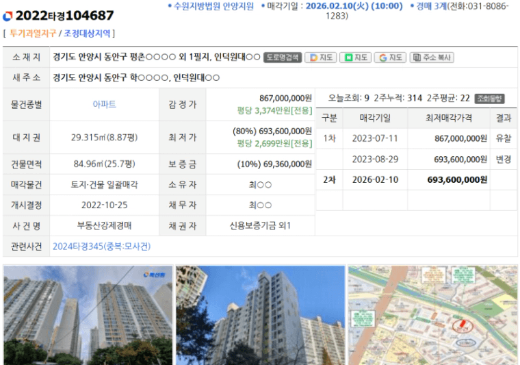 ✔ 감정가 / 최저가: 867,000,000원 / 693,600,000원 (1회 유찰, 80%)