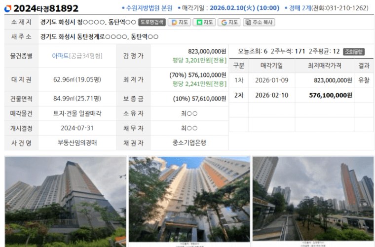인근 매각 사례 또한 뜨겁습니다. 2025년 12월 동일 단지 내 16평형 매물이 신건임에도 불구하고 15명이 응찰하여 감정가의 132%인 8억 7,357만 원에 낙찰되었습니다.