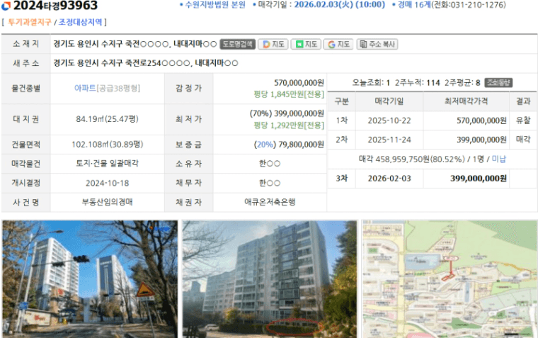 1층 매물이라 선호도는 갈릴 수 있지만 주차 대수가 세대당 1.71대로 매우 넉넉하다는 점은 실거주 시 큰 장점이 됩니다. 수지구 지역의 매각가율이 안정적으로 유지되고 있는 만큼 이번 회차에는 지난 회차보다 많은 응찰자가 몰릴 가능성이 큽니다.