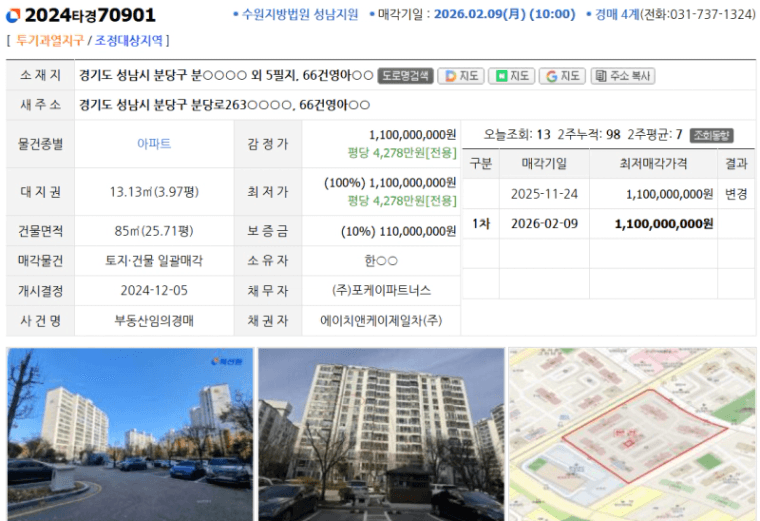 현재 감정가 11억 원에 신건으로 진행 중이나, 최근 분당 지역의 재건축 선도지구 지정 및 이주 단지 논의 등 호재가 겹치며 시장 가격이 감정가를 상회하고 있습니다.