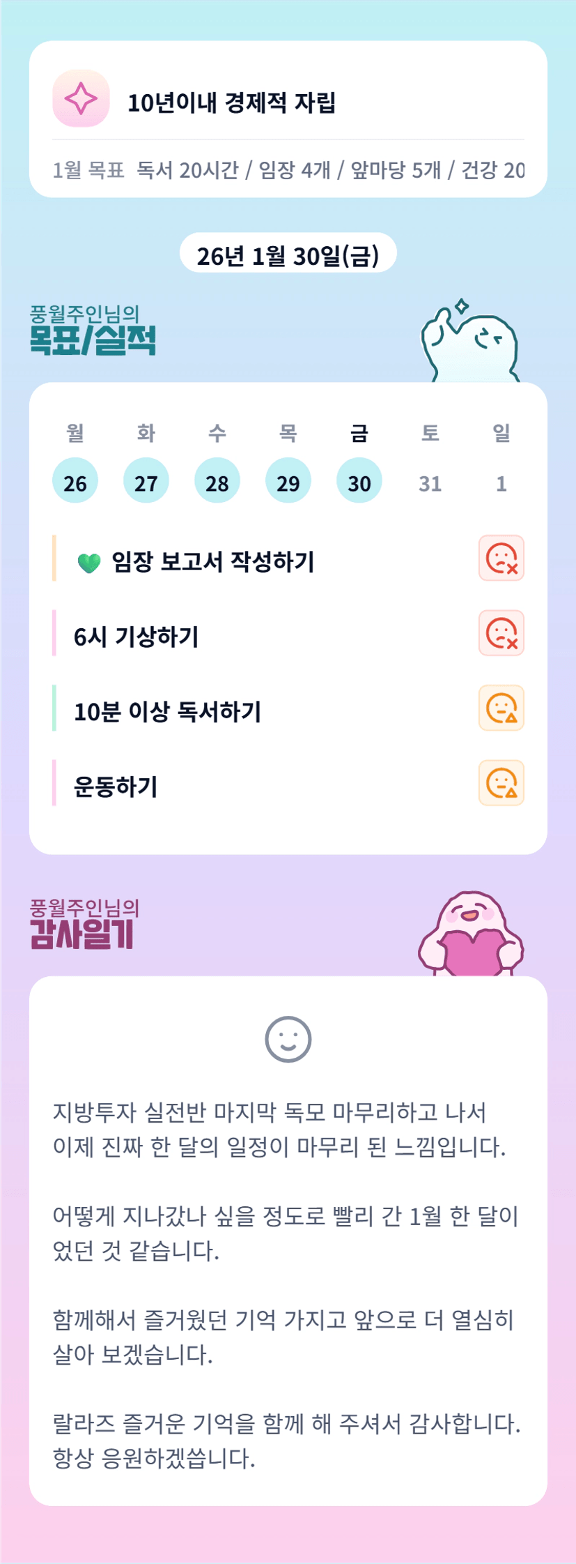 마지막이라니 믿기지가 않네요 ㅠㅠ 1월 한달동안 풍월님의 열정 보면서 많이 배웠습니다. 고생 많으셨고 1호기 화이팅입니다 항상 응원할게요 ><