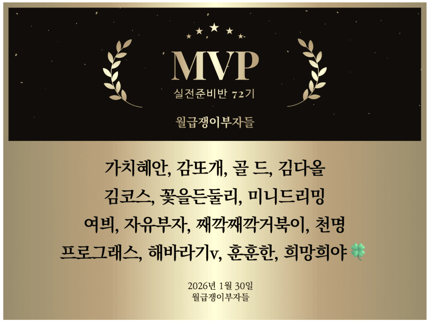 1월 보고서가 심상치 않더라니 MVP 되셨군요 ㅎㅎ 실전반 하이패스 축하드립니다 ^^