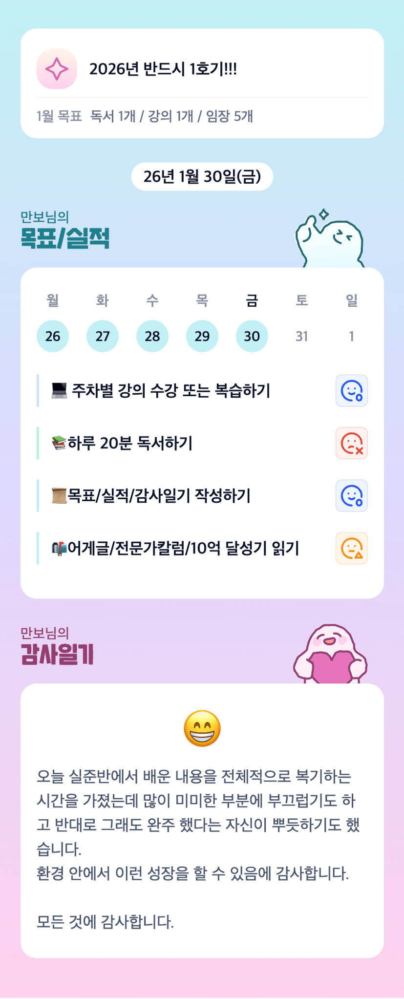 완벽주의가 아닌 완료주의!!ㅎㅎㅎ 만보님 너무 고생 많으셨어요!! 만보님의 2월도 기대합니다!ㅎㅎㅎ 화이팅~~!!