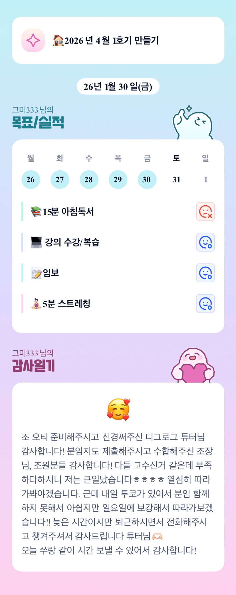 오늘 투코이시군여 그미님!!!진담튜터님과 행복하고 유익한 시간 보내시고 오셔요💛파이팅팅!!