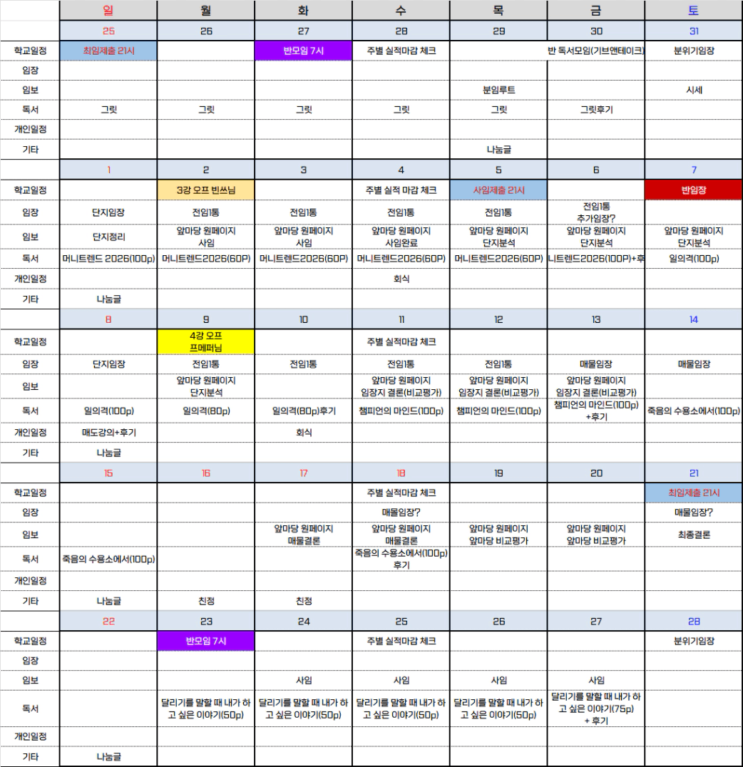 그래도 평일에 4회 이상 임장을 나갈 수 있었고 독강임투 전체를 붐업시키면서 목표 횟수만큼 채웠다는 것은