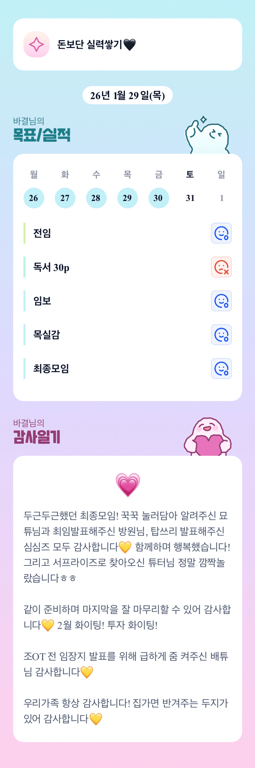 목실감만 읽어도 실전반 이어서 하는 일정이 바빠보여요 ㅋㅋㅋ 추위 조심하시구 건강 챙겨가면서 오래오래 월부해요 ㅎㅎ 화이팅임니다 👍🏻