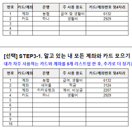 3단계. 자주 쓰는 계좌와 카드 리스트업하기 (최소 2개 ~ 최대 5개까지 진행하기)