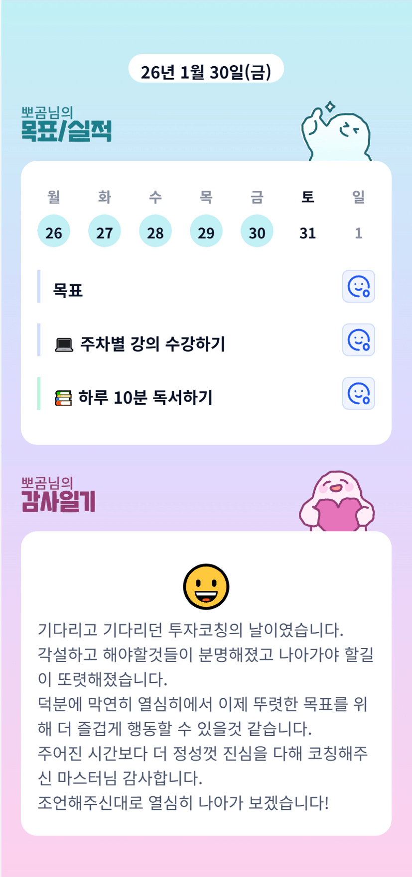 뽀곰님 투자코칭 받으셨군요~ 뚜렷한 목표를 향해 나아가시는 뽀곰님 화이팅!!!