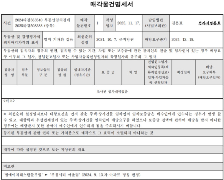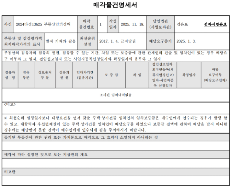임차인 리스크가 없는 물건이며, 관리비 또한 2025년 11월분까지 미납액이 없는 것으로 확인되어 점유자의 관리 상태가 양호할 것으로 예상됩니다.