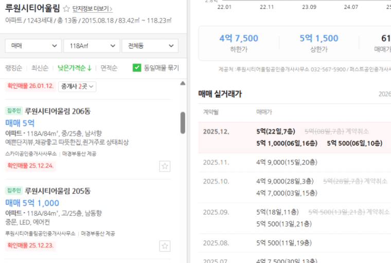 실거래 자료를 분석한 결과, 2025년 10월 동일 평형(84.99㎡) 7층이 5억 원에 거래되었으며, 9월에는 21층이 5억 500만 원에 거래된 기록이 있습니다. 12월에는 5~5.1억 정도에 거래가 되었네요.