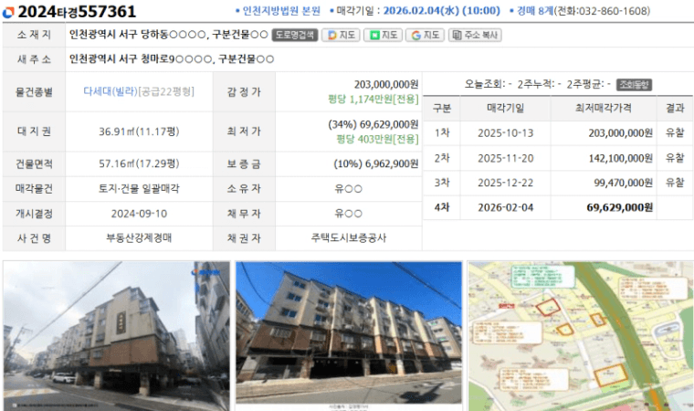 인천 서구 당하동에 위치한 연립주택이 3회 유찰되어 감정가 대비 34% 수준인 6,962만 원까지 떨어졌습니다.