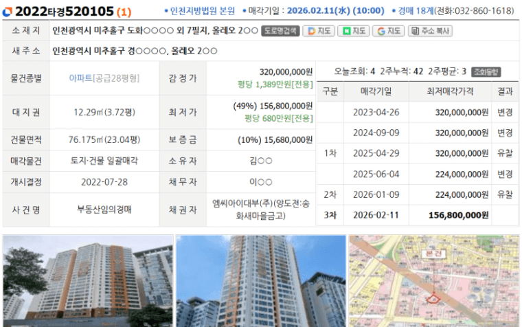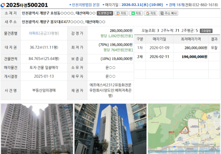 인천 계양구 효성동에 위치한 '태산' 아파트 101동 7층 물건이 감정가 2억 8,000만 원에서 1회 유찰되어 최저가 1억 9,600만 원에 2회차 입찰을 진행합니다.