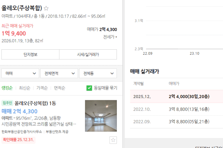 이번 물건은 '올레오' 단지 내에서도 20층이라는 고층 매물이라는 점이 장점입니다. 2018년 준공된 신축급 건물이라 내부 상태도 양호할 것으로 보입니다. 다만, 일반상업지역 내 나홀로 아파트 성격이 강해 시세 상승 탄력보다는 단기투자나 임대 수익 목적으로 접근하는 것이 적절해 보이더라고요.