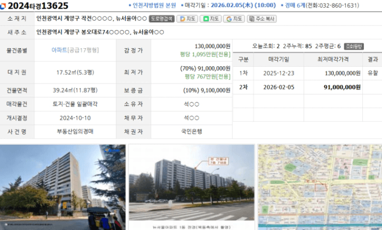 인천 계양구 작전동에 위치한 구축 단지인 뉴서울아파트가 한 차례 유찰되어 감정가 대비 70% 수준인 9,100만 원에 경매가 진행됩니다.