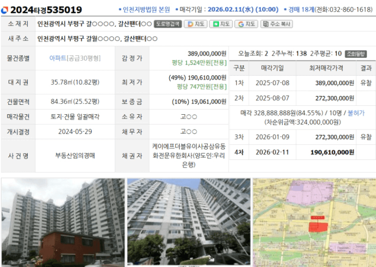 인천 부평구 갈산동에 위치한 '갈산팬더' 아파트가 감정가 대비 49% 수준인 1억 9,061만 원에 3회차 입찰을 앞두고 있습니다.