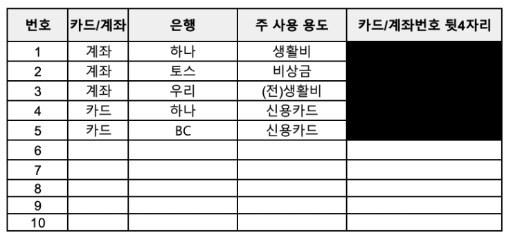 3단계. 자주 쓰는 계좌와 카드 리스트업하기 (최소 2개 ~ 최대 5개까지 진행하기)