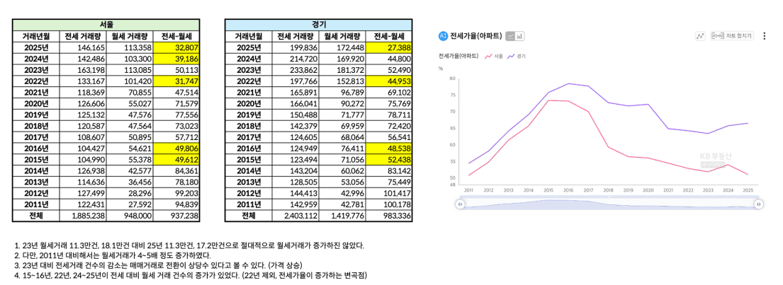 특히, 머니트렌드에서 “전세의 월세화”에 대한 이야기가 나와서 팩트체크를 해보고 싶었습니다. 전세가율이 증가하기 시작하는 변곡점에서는 월세가 증가하는 경향을 보였는데 이는 월세 뿐만 아니라 전세도 마찬가지였습니다. 즉 전세가율이 증가하는 시기에는 매매보다는 임차의 수요가 많아지면서 발생하는 흐름으로 보입니다. 지금까지의 데이터를 넘어서 앞으로도 이 부분은 꾸준히 트래킹하며 정말 “전세의 월세화”가 진행되는지 지켜볼 필요가 있음을 느꼈습니다.