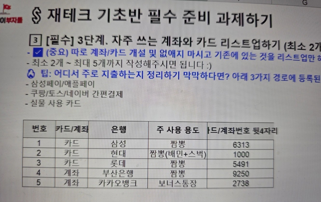 3단계. 자주 쓰는 계좌와 카드 리스트업하기 (최소 2개 ~ 최대 5개까지 진행하기)