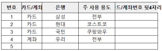 3단계. 자주 쓰는 계좌와 카드 리스트업하기 (최소 2개 ~ 최대 5개까지 진행하기)