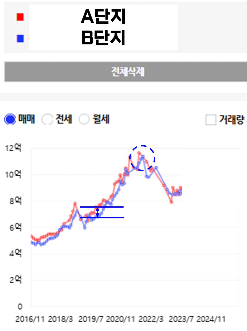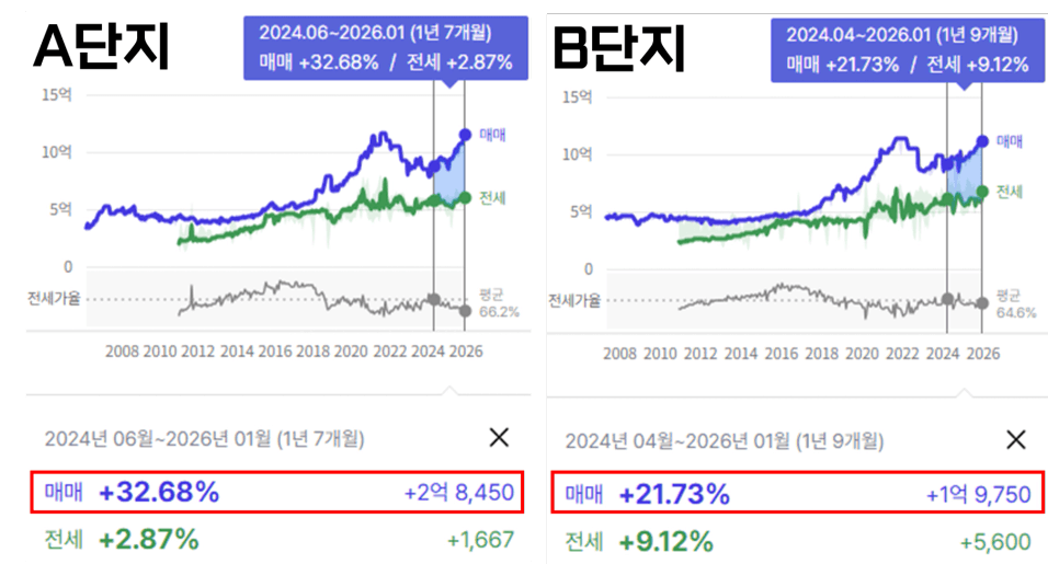 - 지금 현재의 매매 상승률은 A단지의 경우가 더 높은 것이 분명합니다.