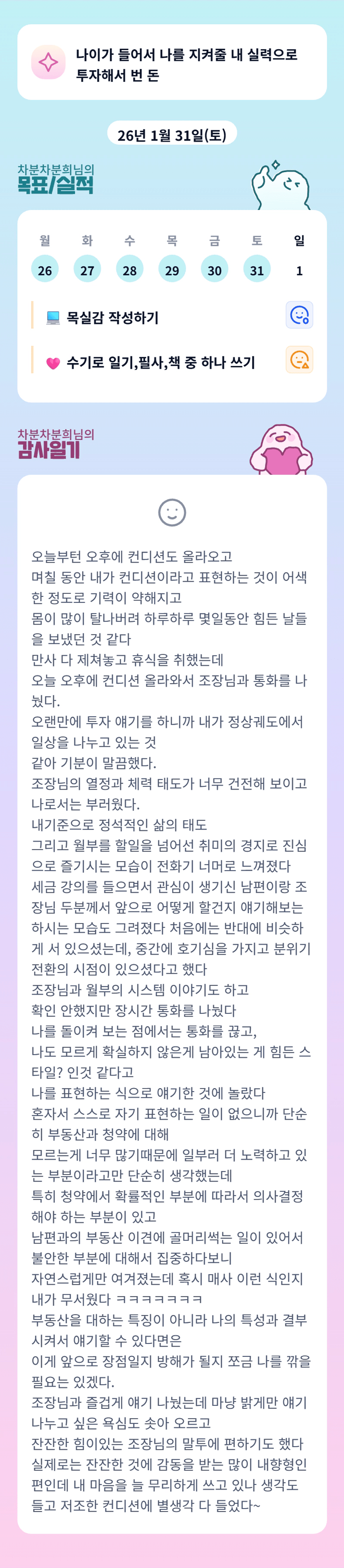 차분희님, 맛난거도 드시고 자신을 위한 시간도 가지셨을까요? 20대때 에너지 많이 쓰셨으니 너무 힘들게 지칠 정도로 하시지말고 길고 꾸준히 가도록 해 봐요💕오늘 통화하면서 밝은 기운 느껴서 좋았고, 차분희님을 더 알아가는 시간이 되어서 좋았답니다. 매임 시간 맞으면 같이 가용. 차분희님! 파이팅!😄👍🏻🫶