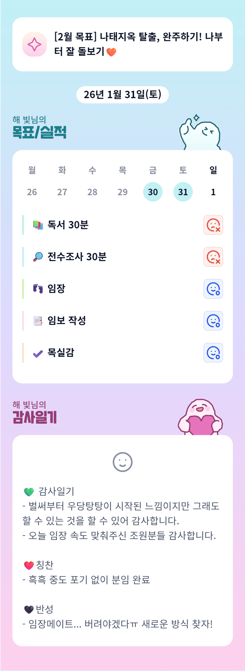 해빛님 반성하실 것 까지 없죠!! 새로운 방식을 찾아봐야겠다는 생각도, 앞으로 새로운 방식을 적응해 나가는 과정도 성장하고 있다는 증거니깐요!! 이번 조에 워낙 대단하신 분들이 많으시기 때문에 많이 성장하는 한 달 되실 것 같습니다!!