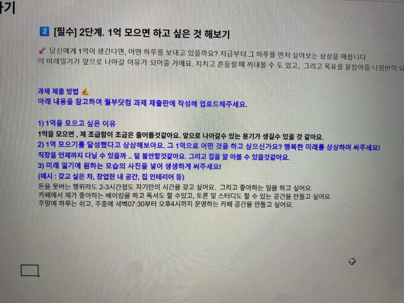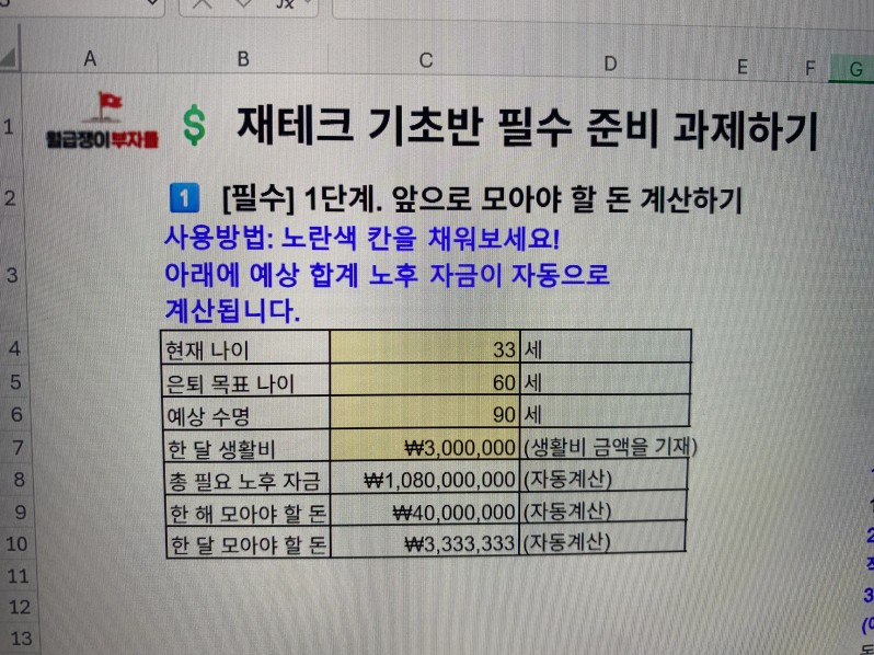 나름 고정비,생활비,용돈 분류해서 계산해서 쓴다고 생각했었어요. 하지만 막상 계산해보고 숫자로 보니까 .. ‘이렇게 많이 쓰고 있었나’ 충격이 였습니다. 숫자로 계산해보니까 , 은퇴 시 얼마나 필요하고 , 내가 아낄 수 있는 금액이 한달일 경우 소액이지만 1년,5년 이상 모으면 큰 돈이 된다는 것을 볼 수 있었어요. 앞으로 강의 들으면 과제 꼭 하고 ! 완벽하지 않아도 조금씩 어제보다 나은 제가 될 려고 행동하겠습니다. 앞으로 과제랑 강의가 기대 돼요!