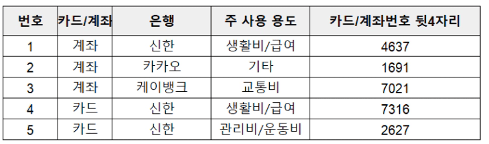 (중요) 따로 계좌/카드 개설 및 없애지 마시고 기존에 있는 것을 리스트업만 해주세요!