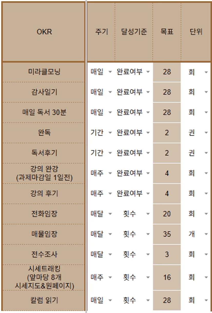 - 목표 : 전수조사 3회, 매일 밤 자기 전 30분 시세 루틴 16회, 칼럼 읽기/댓글 28회