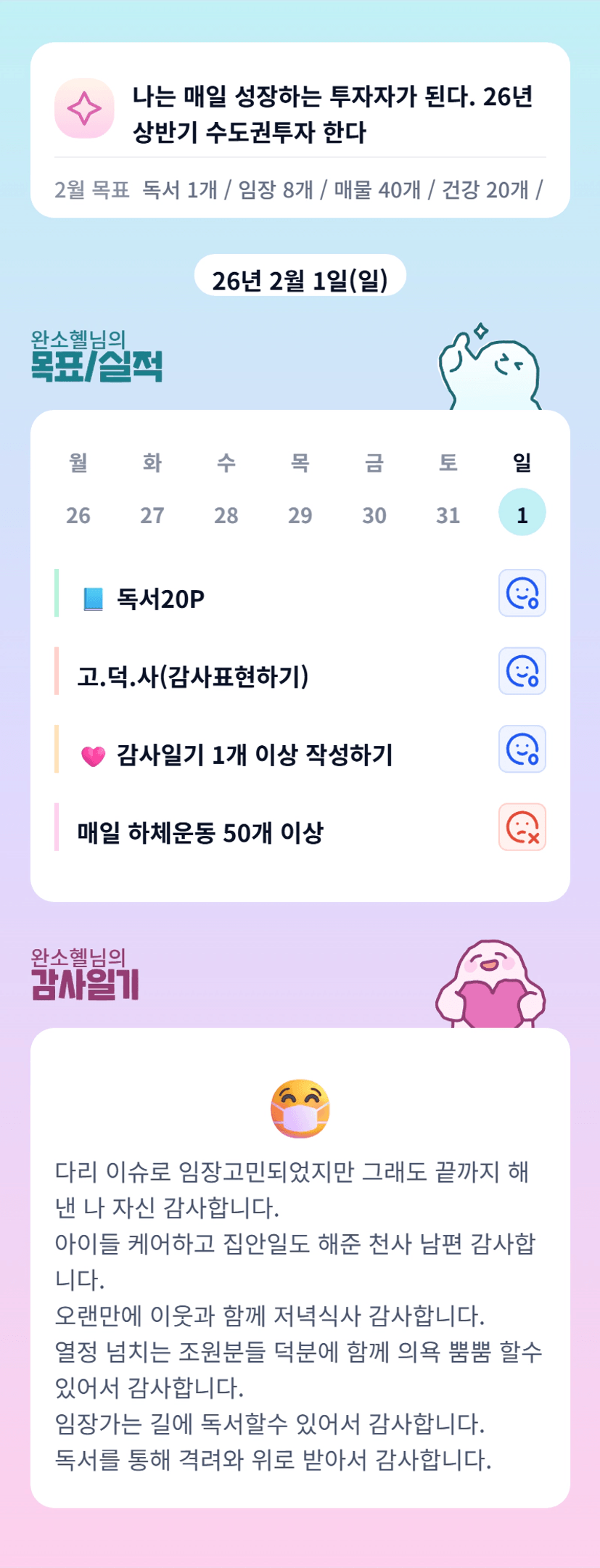 우리 완소님 다리 어서 나으시길!! 오랜만에 만나서 너무 신기하고 좋았어요 ㅎㅎ 끝까지 해 낸 완소님 !! 멋져요 한달동안 함께 홧팅이에요!