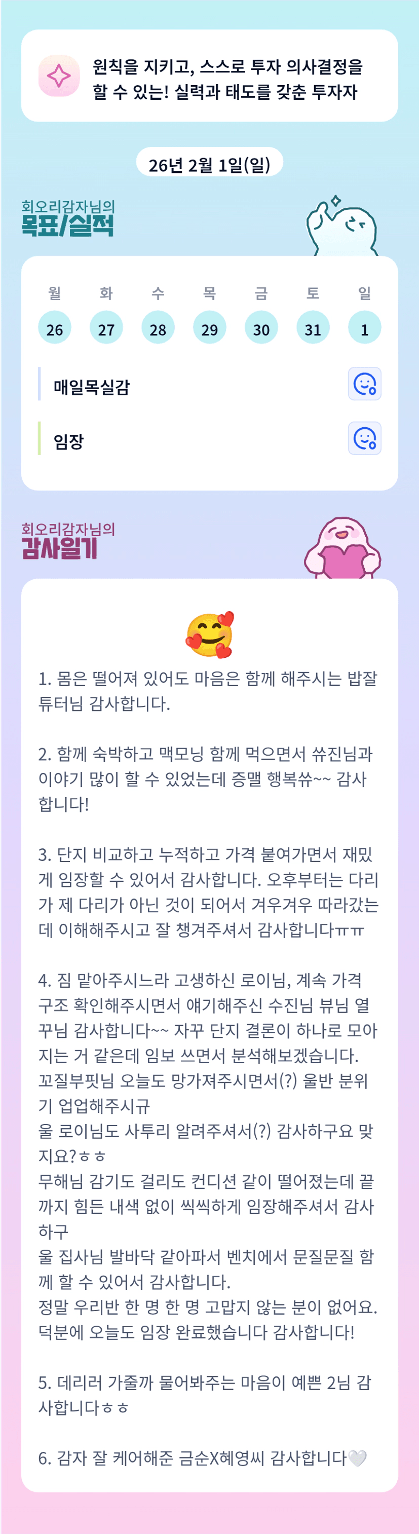 감자님 배려 존중 하고 계신거 맞져~~~!~! ㅎㅎㅎㅎ 나중엔 감부님도 힘들다하셨는데 ㅠㅠ 발목 괜찮으시겠죠??? 아프면 안돼에에에🔥🙏 잘 회복하고 만나요 토요일에..😌 계속 신경써주셔서 감사해요오💙