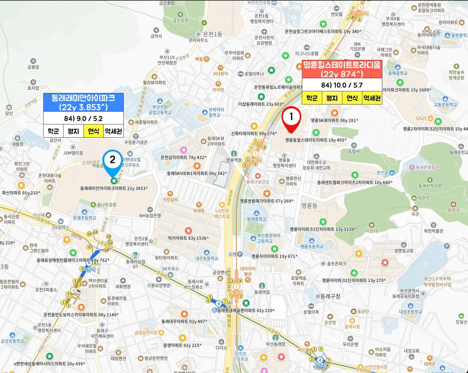 동래구 내 2등 생활권인 명륜 소재 신축 명륜힐스테이트트라디움(22y 874^) vs