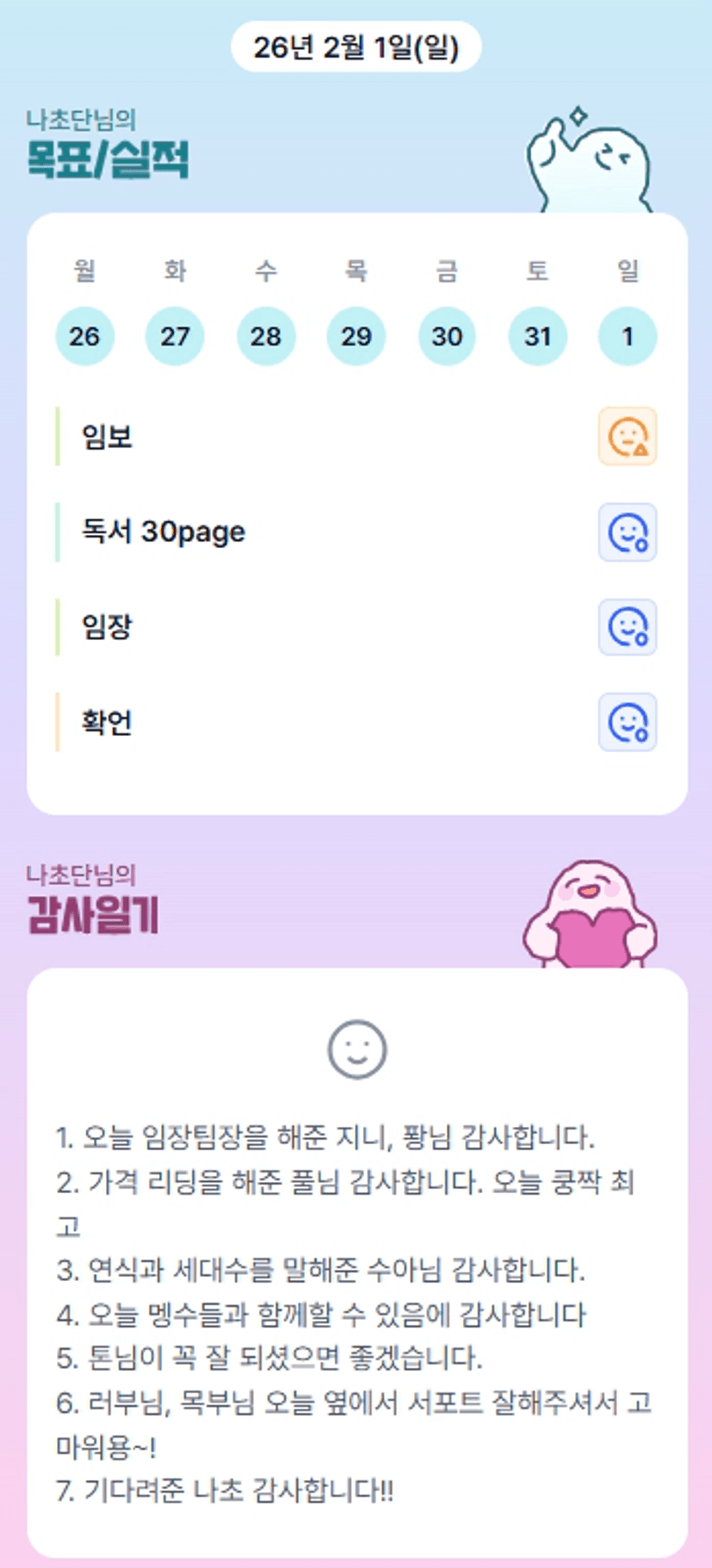 반장님 저희없는동안 외로우셨져?(전혀그래보이지않지만) 고생하셨숩니다!! 이제 더 잘 서포트할게용!