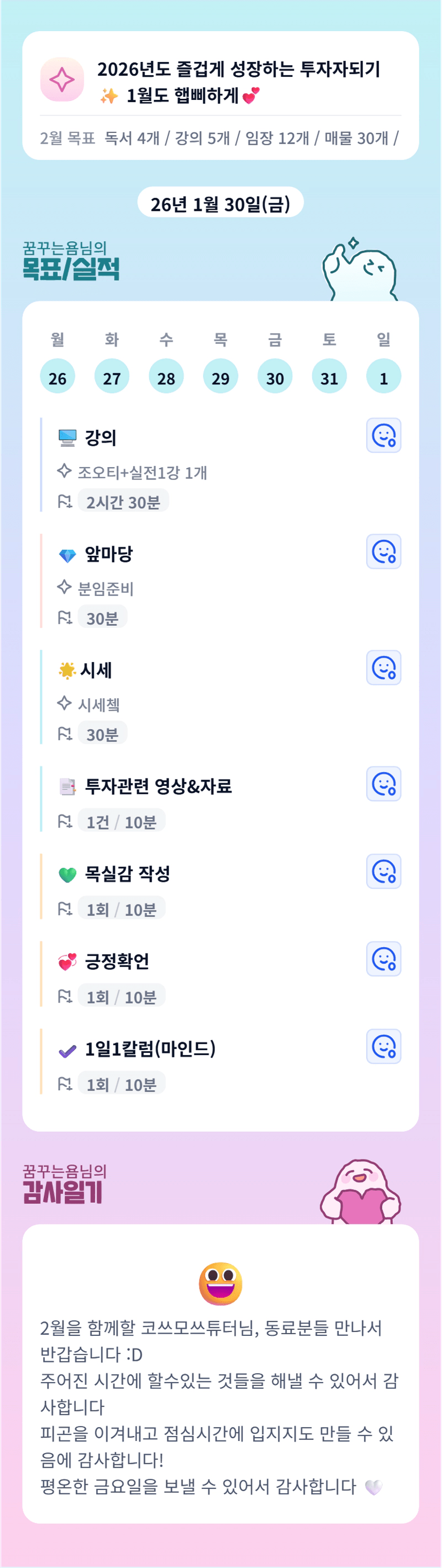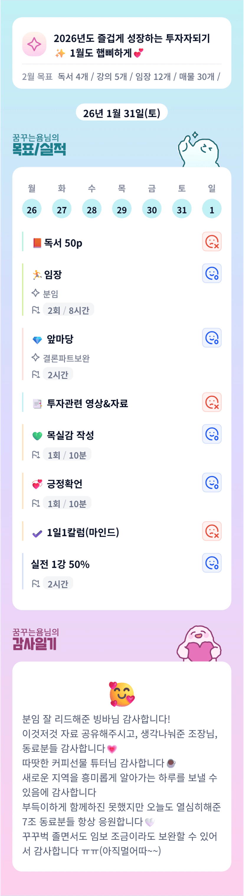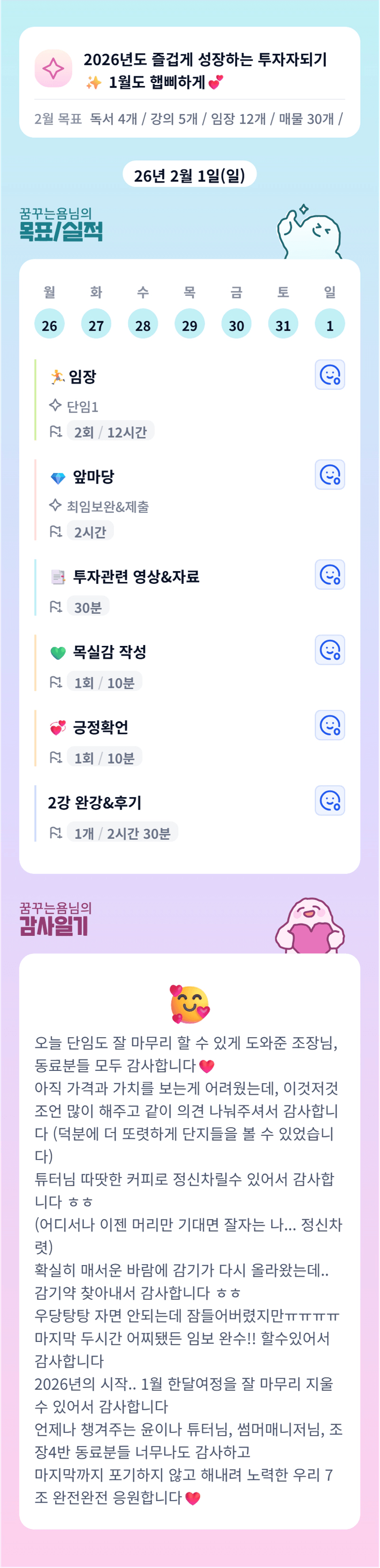 욤님 ! 이번 주말도 고생 많으셨어요! 이번주도 우리 빠이팅해요 👍👍👍