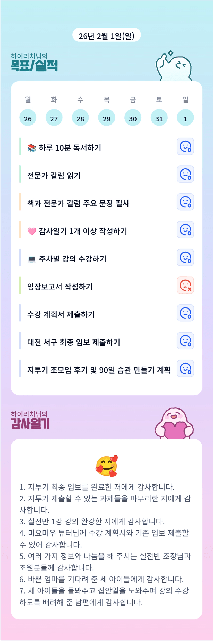 리치님 세아이의 엄마시라니 너무 멋지고 대단하세요! 지투기 완료!! 너무 수고많으셨어요 :) 함께 2월달 할 수 있어서 좋아요 함께 화이팅해보아요♡