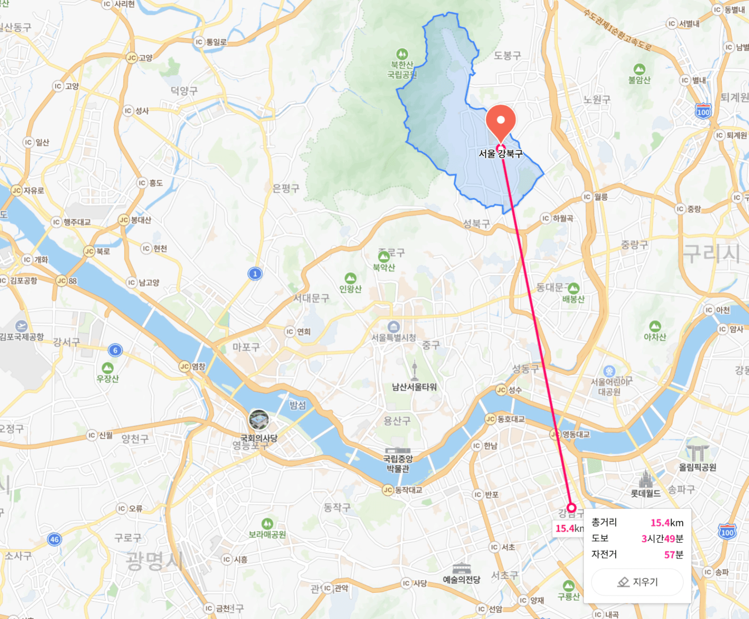 강북구의 위치를 보면 성북구와 노원구 사이에 위치하며 실제로 강남과의 물리적 거리는 가까운 편이 아닙니다. 서울에서 중심부로부터 다소 외곽에 자리하고 있는 건 사실입니다.