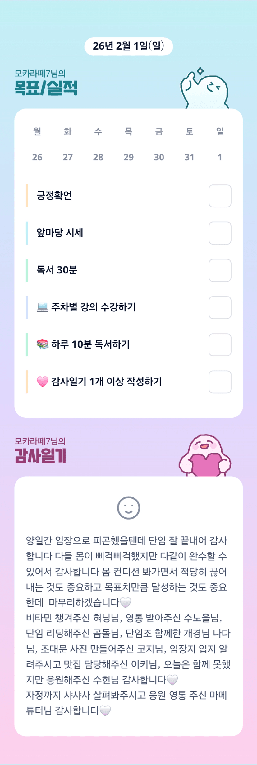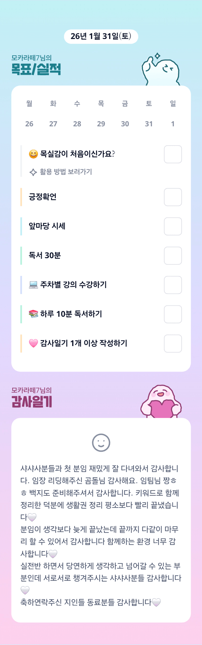 조장님 어제 늦게까지 수고 많으셨어요ㅠㅠ 감기안걸리셨어요? (근데 요고 1/31, 2/1 이어요...ㅎ)