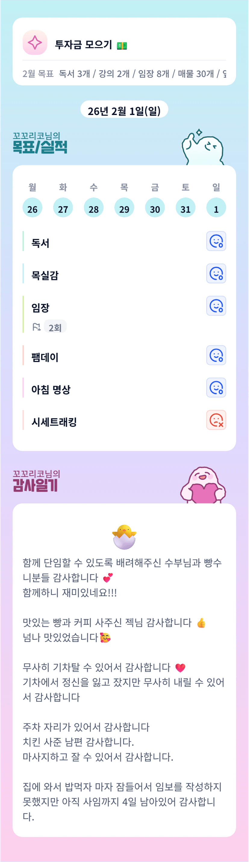꼬님 저녁은 치킨이였군요 ㅎㅎ 어제 단임 하며 꼬님 어떻게 혼자하셨을까 싶었어요 혼자 넘 애쓰셨어요!!! 일요일 잠깐이나마 함께해서 즐거웠습니다:)