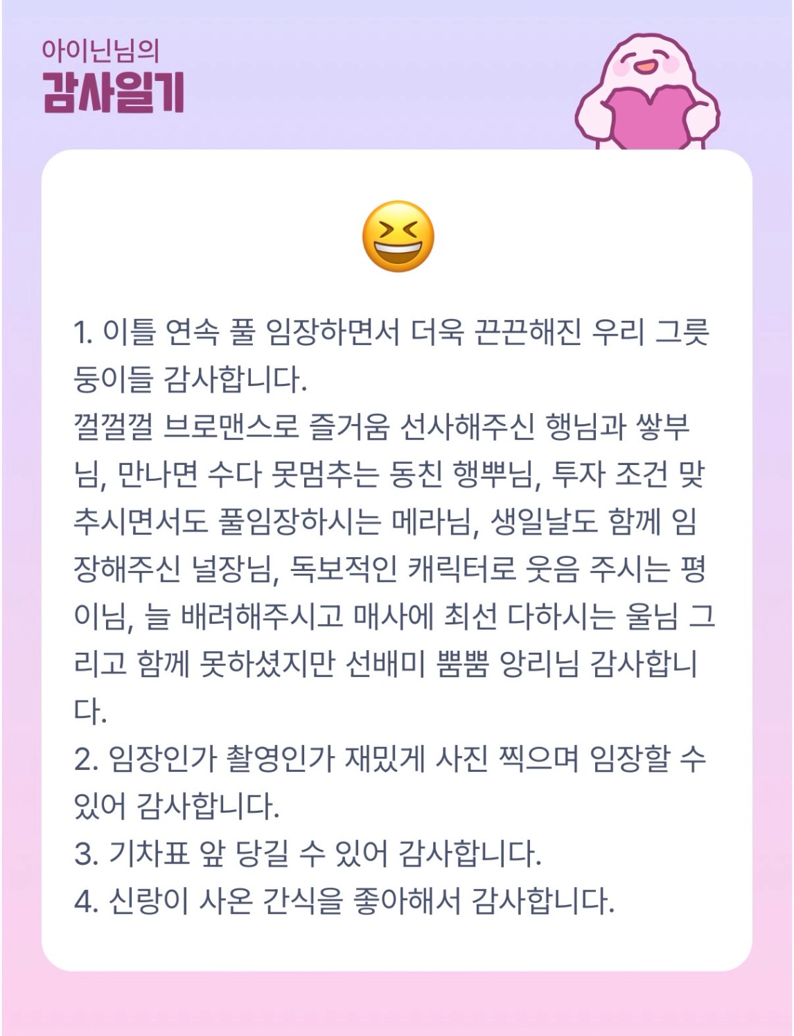껄껄껄 ㅎㅎ 닌 선배 덕분에 아주 편하게~~ 그리고 알찬 이틀이 된 것 같습니다. 정말 감사합니다!!💛