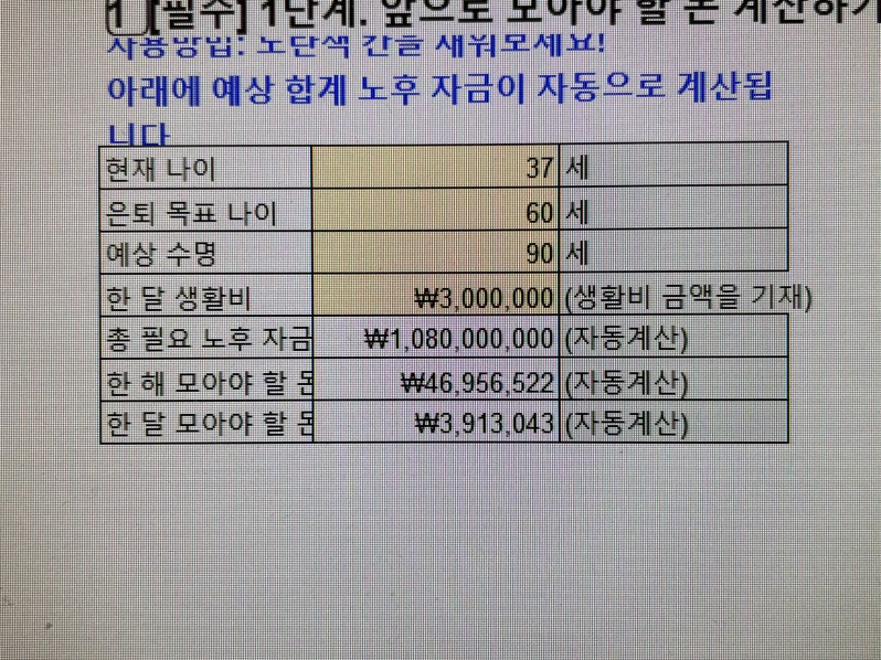 B. 한 해 모아야 할 돈: A. 총 필요 노후 자금 ÷ (2. 은퇴 목표 나이 - 1. 현재 나이)