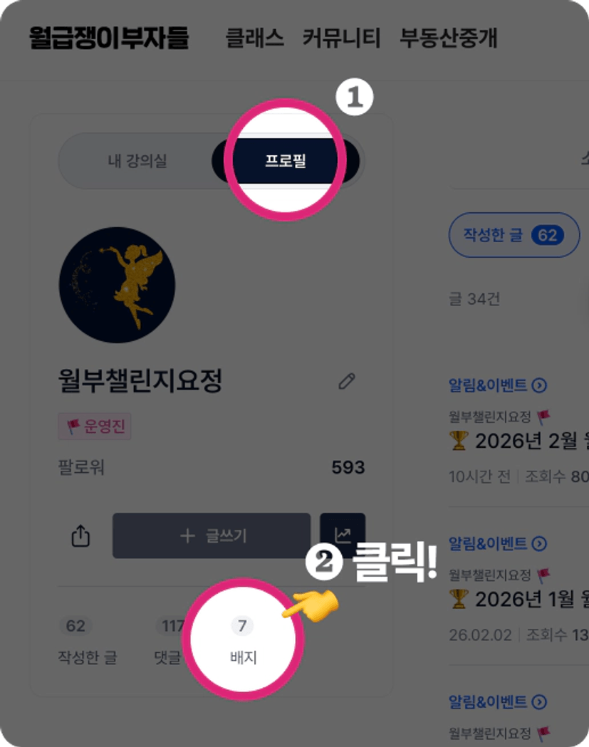 ❷ 배지를 클릭하면 보유중인 배지를 확인할 수 있어요.