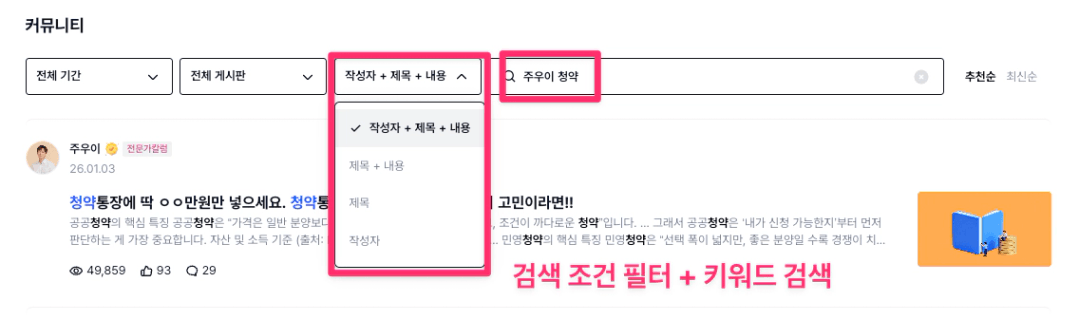 3. 특정 작성자가 쓴 특정 글을 보고 싶다면 → 검색 조건 필터 중 [작성자+제목+내용] 선택하고 키워드를 검색하세요.