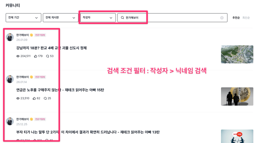 2. 특정 작성자가 쓴 글만 보고 싶다면 → 검색 조건 필터 중 [작성자] 필터를 선택하고 닉네임을 검색하세요.