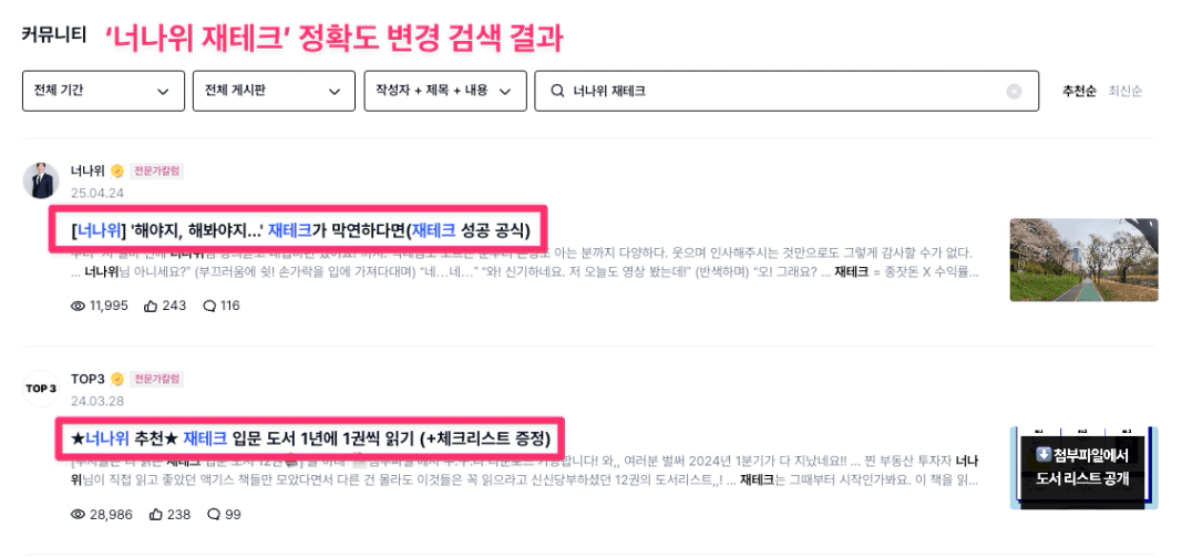 본문에 ‘너나위’ 또는 ‘재테크’가 있으면 그 글들이 검색 결과에 상당 부분을 차지했어요.
